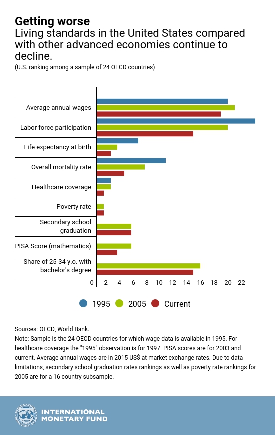 These constraints include weak productivity growth, an aging population, falling labor force participation, an increasingly polarized income distribution, and high levels of poverty. These growing headwinds are made worse by a share of income paid to workers that is nearly 4 percentage points lower than that in the early 2000s, a middle class that has shrunk to its smallest size over the past 30 years, and a potential growth rate that is virtually the lowest since the 1940s.