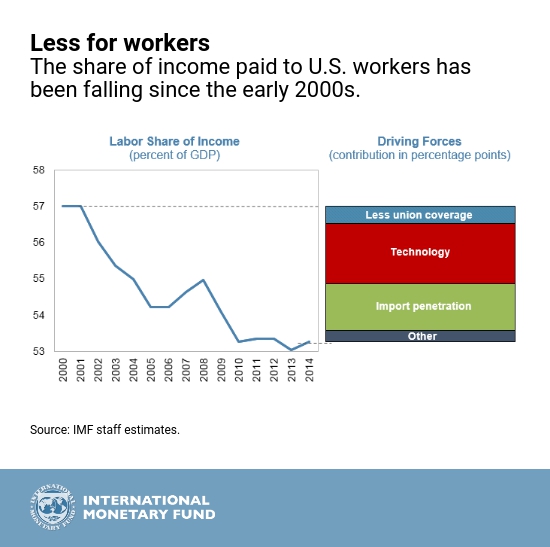 - Minimizing the unintended consequences of technology and import penetration A recent IMF study shows that the decline in the U.S. share of income that is paid to workers is broad-based across states and industries, but that the extent of the fall varies greatly. Exploiting a new data set on the characteristics of occupations and other sources, the study finds that in addition to changes in labor institutions, technological change, and different forms of trade integration have lowered the labor share. In particular, the fall was largest, on average, in industries that saw a high initial intensity of “routinizable” occupations, steep declines in unionization, and a high level of import penetration—which captures competition from abroad to what domestic firms sell plus how much imported inputs these firms use. Quantitatively, the study finds that the bulk of the effect comes from changes in technology that are linked to the automation of routine tasks, followed by import penetration. Policies that help labor adjust—such as programs that upgrade workers’ skills—will be needed.