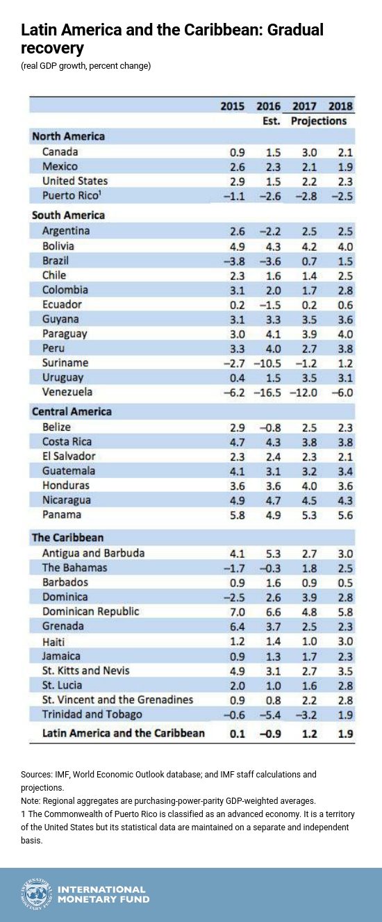 Economic activity in Latin America remains on track to recover gradually in 2017–18, but long-term growth remains stuck in low gear, slowing progress in catching up to income levels in advanced countries, according to the IMF’s latest regional update.
