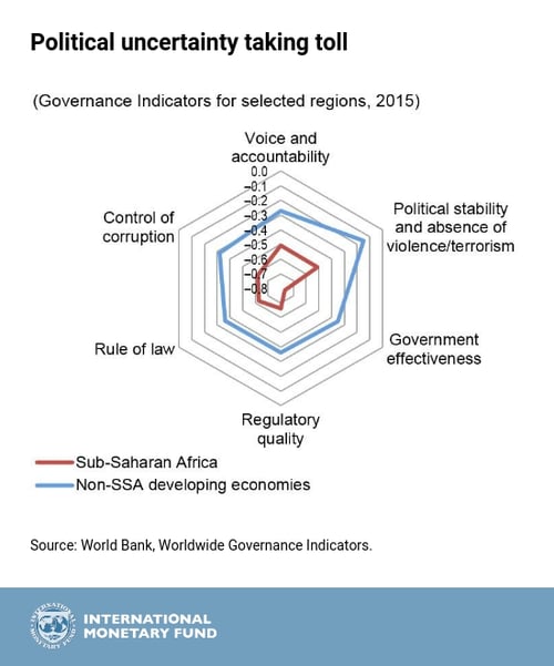 These vulnerabilities are being compounded by political uncertainty resulting in a lack of clarity about future direction of economic policy, notably, in some of the region’s largest economies such as Nigeria or South Africa. This is weighing on consumer and investor confidence.