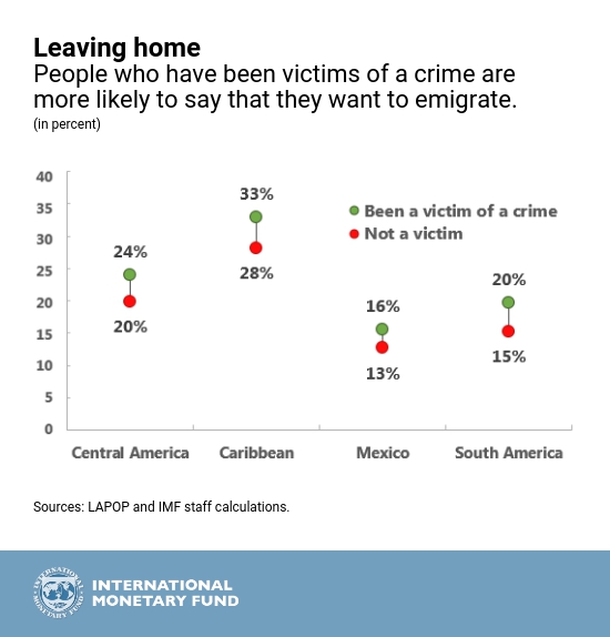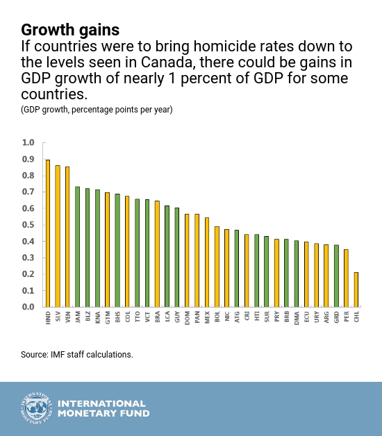 According to recent research by the Inter-American Development Bank, direct crime-related costs range from 3 to 5 percent of GDP in the Caribbean every year, compared to 2 percent of GDP in advanced economies. In addition, forthcoming IMF research suggests that if Caribbean countries were to lower their murder rates to those of, say Canada (for illustrative purposes), growth would be between 0.4–0.7 percentage points higher per year. Illustrative results using Caribbean victimization surveys also find that being a victim of a crime increases a respondent’s desire to emigrate by over 5 percentage points. In fact, addressing crime in Jamaica, Belize, Bahamas, and St. Kitts and Nevis would yield higher gains to growth than increasing human capital levels alone, as the latter can be lost to brain drain if crime is not addressed.