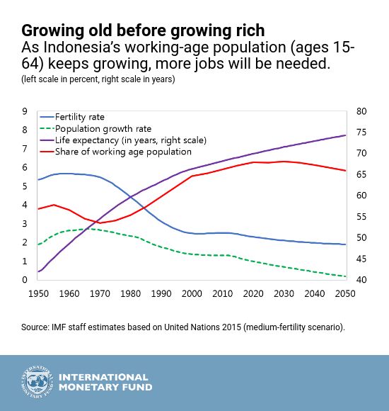 • However, as the share of the working-age population (ages 15-64) keeps growing, more jobs will be needed. Indonesia—the fourth most populous country in the world—is undergoing a demographic transition. Its working-age population is projected to continue to increase as a share of total population until 2030. This young and growing workforce will need quality jobs. That is why now is the time to implement structural reforms to step up growth—so that the country can grow prosperous by reaping its demographic dividend before it grows old.