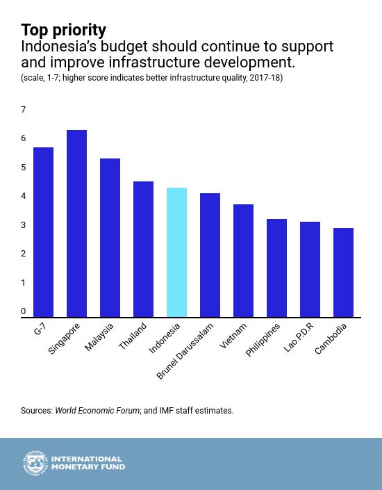 • Indonesia should continue to prioritize infrastructure development. The government has embarked on an ambitious infrastructure development plan that includes 247 national strategic projects with a total cost of 32 percent of GDP. The plan aims to improve logistics, power generation, water and sanitation, and oil refineries. Public spending on infrastructure—supported by tax revenues—should continue to ensure the plan’s success. Infrastructure development would also spur private investment and raise potential growth, which would result in faster job creation and more employment opportunities for the young labor force.