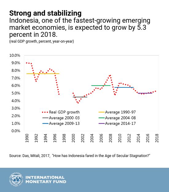 Indonesia continues to enjoy robust growth—projected at 5.3 percent for 2018—thanks in large part to a pickup in investment, as well as higher commodity prices, according to the IMF's latest assessment of the economy.