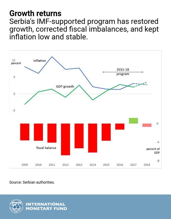 In 2014 Serbia’s economy was in serious trouble. Following the 2008 global financial crisis, the country’s economy stagnated, while weak public institutions, collapsing tax receipts, and overspending by government and state-owned enterprises resulted in a rapid buildup of public debt. Recognizing the unsustainable situation, the authorities adopted an ambitious program of fiscal adjustment, financial sector strengthening, and broad-based economic reforms. The IMF supported the program with economic advice and monitoring, along with precautionary financing.