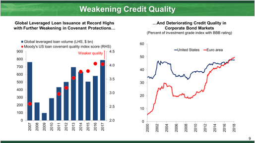 There are similar trends in credit quality in corporate bond markets, where lower-rated corporates in the United States and in the Euro area now account for a greater proportion of bonds than they did 10 years ago.