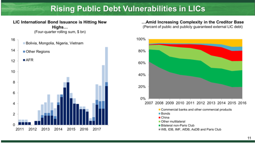 The share of Paris Club debt has declined from 62 percent to 28 percent between 2007 and 2016 — while the share of external financing provided by commercial and non-Paris-Club creditors has doubled. This could pose challenges for ongoing and prospective debt restructurings, with the potential for unpleasant surprises for private creditors.