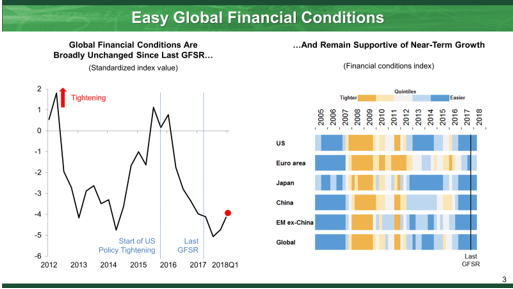 Near-term growth prospects continue to look favorable. This is partly because easy financial conditions have dampened — although not eliminated — near-term risks to growth.