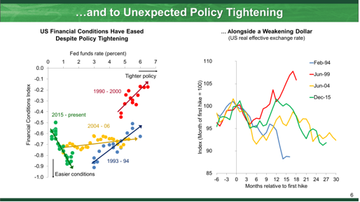 The monetary-policy normalization process has also been accompanied by a weakness in the U.S. dollar — which is not unusual during periods of monetary-policy tightening, so long as overall financial conditions remain relatively easy.