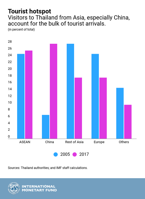 Tourism is a key driver of growth and of the large current account surplus, which stood at 10.6 percent of GDP in 2017. More than 34 million tourists visit Thailand yearly. A boom in tourism is good news for the economy, but the gains—concentrated in a few select tourist hotspots—have yet to benefit other sectors of the economy.