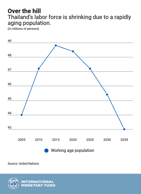 Promoting participation in the workforce can help Thailand ease the impact of a shrinking labor force due to a rapidly aging population. Although women’s participation rate in Thailand is relatively high by international standards, it still lags that of men. Government support for child care services can increase women’s participation in the workforce and boost labor productivity. Pension reform, including increasing the pensionable age and providing adequate coverage, would also help to increase overall labor force participation in the country.