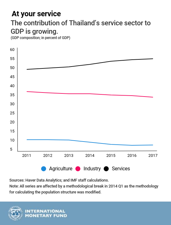 Thailand’s service sector is expanding, while the government is embracing the digital revolution to boost productivity. The government recently launched a national e-payment system that would help boost tax collection efficiency. In addition to upgrading the country’s strong manufacturing base in automobiles and electronics, policy focus is also extending to new sources of growth. These include industries such as robotics, aerospace, and biotechnology. As automation continues to transform the future of work, promoting education and training initiatives in the country can help upgrade skill-sets for today’s and tomorrow’s global job market.