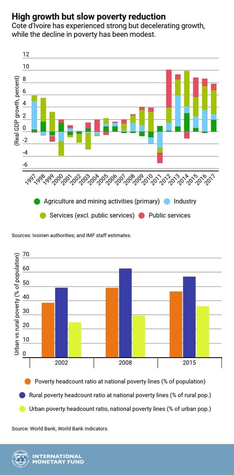 Half of the Ivoirien workforce is employed in agriculture, and the majority are from rural areas. About 60 percent of families headed by an agriculture employee are poor. Women account for 40 percent of agricultural workers, and more than half of all the workers are unschooled. Improving the business and regulatory environment for agriculture, which accounted for one-fourth of the growth in 2017, would help boost inclusive growth.