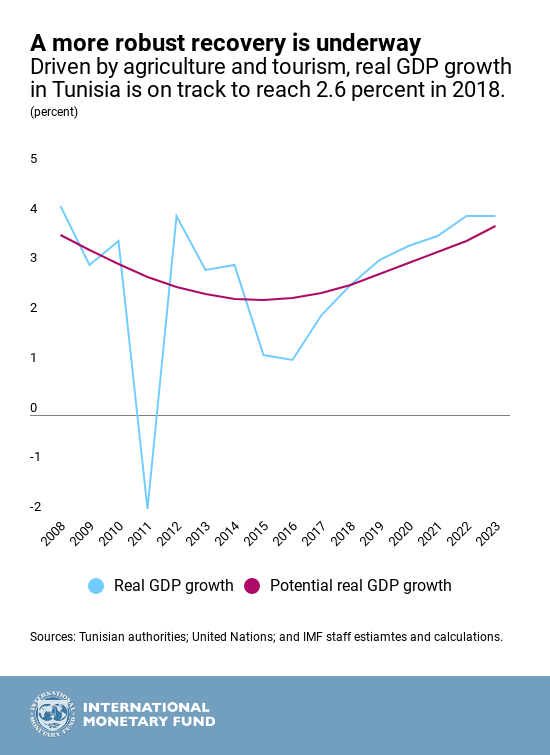 Strengthening governance and enforcement in the government’s anti-corruption fight, building a competitive business environment, implementing a fairly-valued exchange rate, providing investment incentives to increase productivity, and reducing red tape are all necessary to overcome investor reluctance and build confidence. Doing so will help unleash the potential of the private sector to generate more opportunity and jobs for all Tunisians.