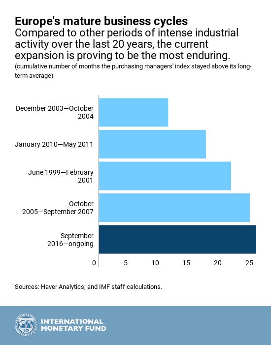 • A long period of manufacturing expansion.  Europe’s manufacturing sector has enjoyed one of the longest periods of expansion over the last two decades. But against the background of a maturing business cycle, production capacity constraints, and labor shortages are constricting growth, especially in emerging Europe. Capacity utilization has now climbed to levels last seen before the global financial crisis.