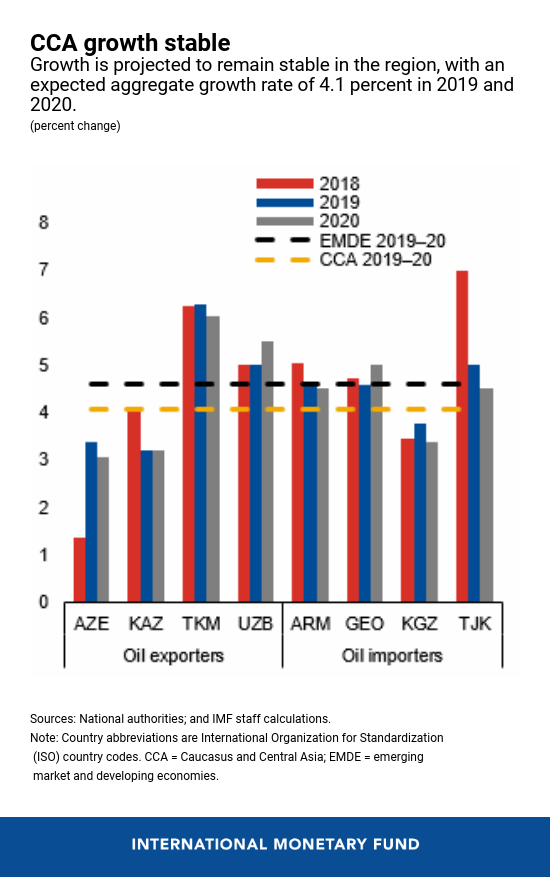 In the years since the significant external shocks of 2014-16, growth in the region has stabilized, in part thanks to efforts to strengthen macroeconomic frameworks, such as tax code reform (implemented in Armenia, Georgia, and Uzbekistan) and the adoption of fiscal rules (implemented in Armenia, Azerbaijan, and Kyrgyz Republic). Strengthening of monetary policy frameworks and efforts to make exchange rates more flexible in some countries have also helped manage external pressures and contain inflation. Overall, growth in the region is projected at 4.1 percent in 2019 and 2020, which is in line with the 4.2 percent growth seen in 2018.