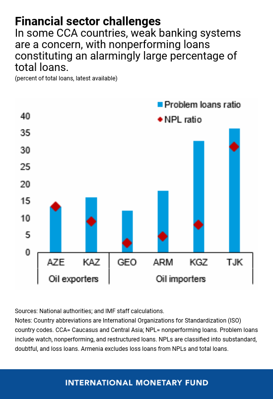 Countries in the Caucuses and Central Asia face legacy challenges from reforms that have long been left unresolved. For example, banking systems are burdened with problematic assets such as nonperforming loans (NPLs) and restructured loans. In some countries, the percentage of loans that have become troublesome has reached alarming levels. Tajikistan’s problem loans, for example, constitute more than 35 percent of its total loans, according to the latest data, with a significant majority of those being NPLs. As a result, pockets of bank stress persist, eroding lending capacity and inhibiting credit growth.