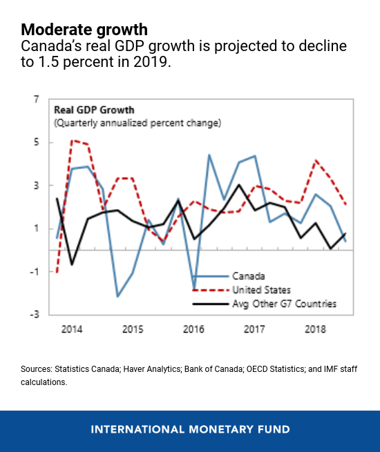 Canada’s economy is growing at a more sustainable rate following the stellar pace set in 2017—the fastest among G7 economies. Growth is projected to decline to 1.5 percent in 2019 due to a disappointing first quarter for exports, more subdued global growth, and slower pace of consumer spending.