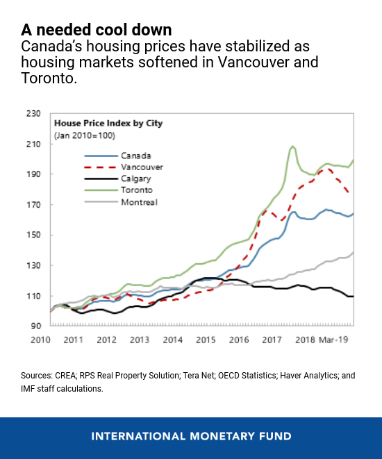 Nationwide, house prices are 2.5 percent lower than the peak in mid-2018. In Toronto, Hamilton, and Vancouver, declines in house prices have reduced speculative “froth” but prices remain overvalued. Overall, policies that strengthen financial stability have been effective in containing housing-related financial stability risks and the current stance is appropriate. While the stock of household debt is still high at 176 percent of disposable income, reductions in housing market imbalances have led to somewhat lower near-term risks to growth and financial stability.