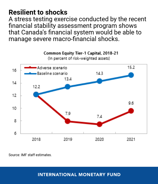 Canada has a robust financial system. Furthermore, according to the recent IMF Financial Stability Assessment Program report, the financial system would be able to withstand severe shocks. However, vulnerabilities—notably elevated household debt and housing market imbalances—remain substantial, posing financial stability concerns. Major deposit-taking institutions would remain resilient because they hold enough capital and liquidity buffers.