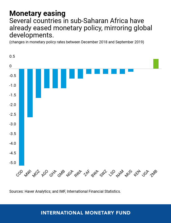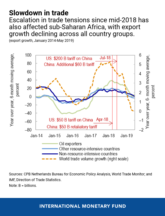 - Growth in the region has been revised down, partly due to a challenging global environment. Rising trade and geopolitical tensions have increased uncertainty, resulting in weak global economic activity and a significant decline in trade volumes. The slowdown of key trading partners is also impacting sub-Saharan Africa, with growth revised down for about two-thirds of countries in the region.