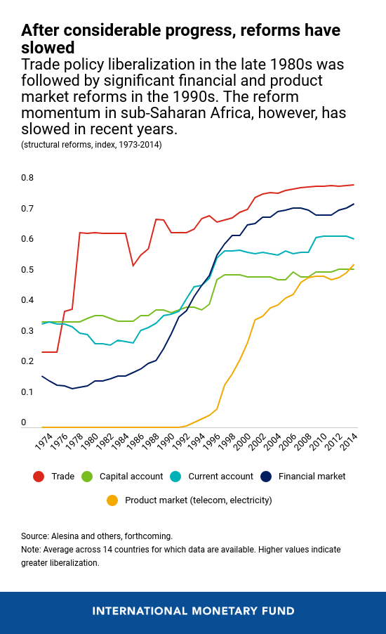 - In the medium term, structural reforms are key to raising growth and creating jobs for the expanding labor force. Starting in the 1980s, significant progress was made in implementing reforms in the region, including trade and financial market liberalization, as well as product market reforms. This period also saw sustained growth in sub-Saharan Africa. The reform momentum, however, has slowed down over the last decade.