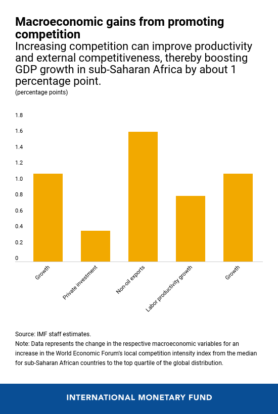 - Enhancing market competition can significantly improve economic performance in sub-Saharan African countries. Competition among firms remains relatively low in sub-Saharan Africa compared to other regions. Boosting competition requires holistic reforms encompassing an effective competition policy framework, openness to trade and foreign direct investment, and business regulations and macroeconomic policies that create an even playing field among firms.