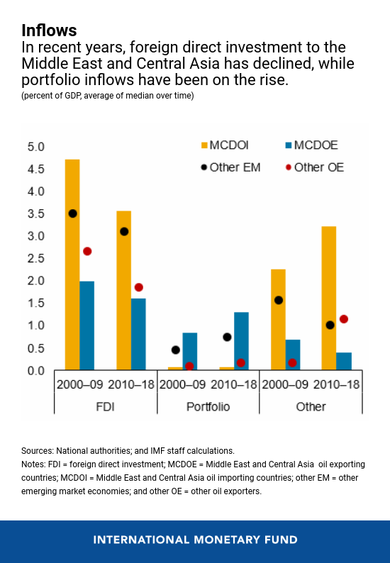 FDI inflows have slowed globally—a trend that has been even more pronounced in MENAP and CCA countries. In 2008, FDI reached $115 billion in the two regions, but between 2015-18, it declined to an average of $46 billion annually. Meanwhile, portfolio inflows, which are foreign purchases of stocks and bonds, have been on the rise. CCA and MENAP countries accounted for 20 percent of portfolio inflows to all emerging markets between 2016-18, up from merely 5 percent before the 2008 global financial crisis.