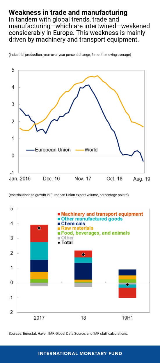 As in the rest of the world, European trade and manufacturing have weakened. There are some signs that this slowdown is spreading into the rest of the economy. While services and consumption have remained relatively resilient in line with strong labor markets, investment is starting to lose steam.