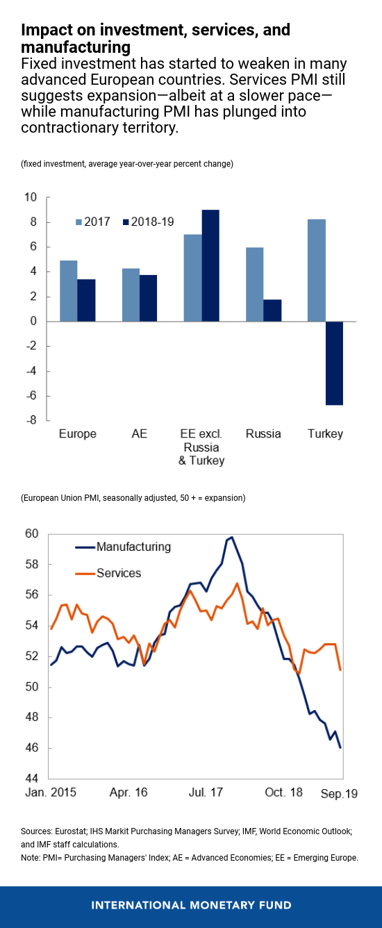 Some signs of spillovers, but still relatively limited. The weakening trade and manufacturing—along with subdued business confidence and elevated trade uncertainty—have started to spill over into investment, especially in many advanced European countries. While the services sector has been relatively buoyant, it too has started to soften. Private consumption, however, has stayed relatively robust.