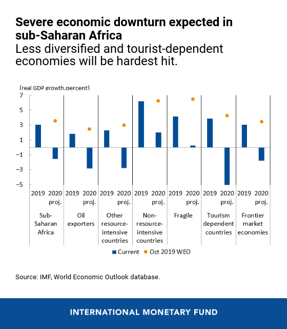 GDP in sub-Saharan Africa is projected to contract by –1.6 percent this year—the worst reading on record. While the effect across countries is expected to differ depending on factors like extent of diversification and dependence on tourism, no country will be spared. Compared to projections made six months ago, growth for 2020 has been revised down for all countries in the region.