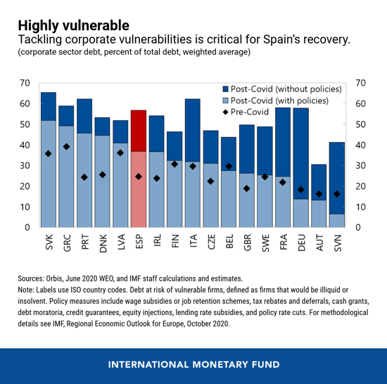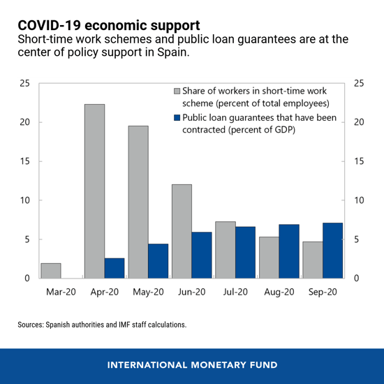 - The Spanish authorities have provided swift income and liquidity support to limit the fallout of the pandemic. The short-time work scheme benefited about 22 percent of salaried workers at its peak. And public loan guarantees have targeted small businesses. In the near term, flexible and agile fiscal support needs to remain in place. Over time, the measures should become increasingly targeted, with a focus on vulnerable groups and viable firms.