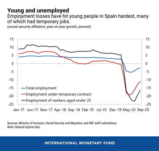 - The pandemic is widening inequalities in the labor market. The job market disruptions among on young, low-skilled, and temporary workers have been especially harsh. Going forward, policies to overcome the overuse of temporary contracts and enhance the employability of dislocated workers through better active labor market policies, such as more targeted vocational training, will be key for greater social inclusion.