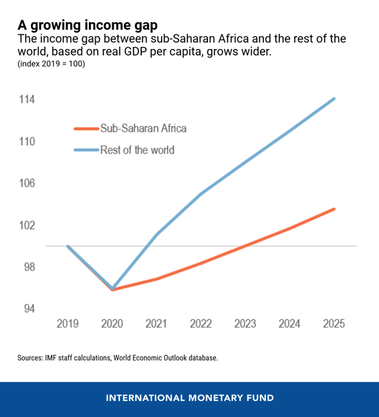 On current forecasts, per capita GDP in many countries is not expected to reach pre-crisis levels until the end of 2025. Limited access to vaccines and the region’s lack of fiscal space are expected to weigh on the outlook. As a result, the gap between sub-Saharan Africa’s growth and the rest of the world is expected to widen further over the next five years.