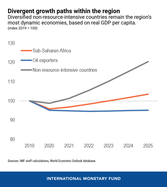 - The pre-crisis divergence between resource intensive and non-resource intensive countries in sub-Saharan Africa will persist. Non-resource dependent countries are forecast to see average per capita incomes rise by 21.6 percent by 2025. Oil exporters, which are some of the more populous countries in the region, will have no gains in per capita income over this period.