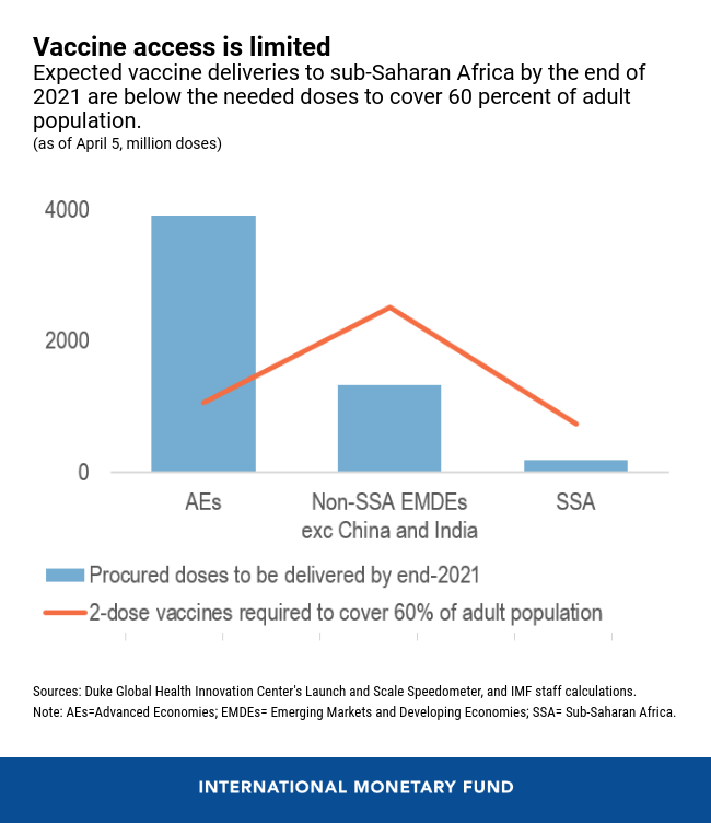 - Lower access to vaccines, slower vaccine rollout, and potentially high cost of vaccinations are holding back the recovery in sub-Saharan Africa. Some advanced economies have secured enough vaccine doses to cover their