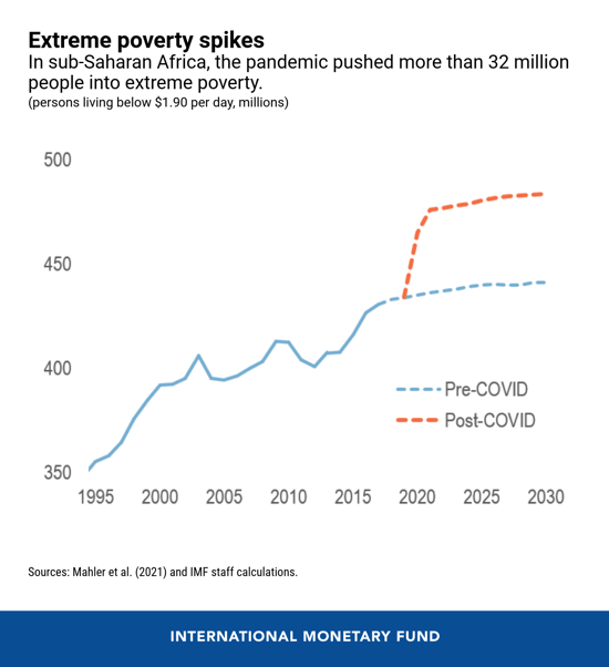 - The COVID-19 crisis is expected to undo years of economic and social progress and leave lasting scars on the region’s economies. The number of people in sub-Saharan Africa living in extreme poverty is projected to have increased by more than 32 million in 2020; the number of missed school days is more than four times the level in advanced economies; and employment fell by around 8.5 percent in 2020. In terms of livelihoods, per capita income has returned to 2013 levels. Stronger social safety nets are needed to channel support quickly and efficiently to those most in need to prevent permanent scarring.