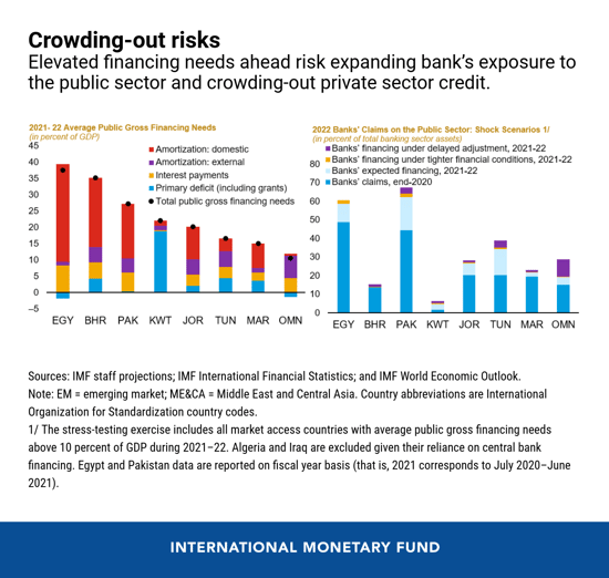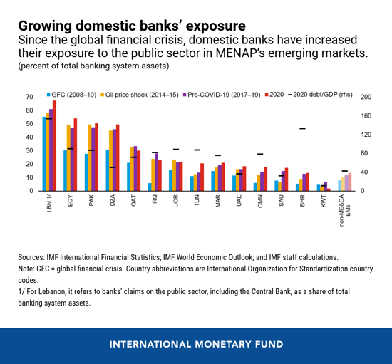 Since prospects for heavily tapping international markets are limited, banks’ exposure to the state is likely set to accelerate in the years ahead. This could crowd out private sector credit at a time when private financing is critically needed to spur the recovery. Moreover, the Regional Economic Outlook estimates that budgetary needs could be further exacerbated by 3 percent of GDP under a potential shock scenario involving rapid tightening of global financial conditions along with delayed fiscal adjustment due to a protracted recovery. If domestic banks fund these unexpected needs, in addition to the expected financing needed during 2021–22, Egypt, Oman, Pakistan, and Tunisia would absorb an additional 10 to 23 percent of banks’ assets as government debt by the end of 2022. As a result, Egypt and Pakistan’s banks could reach levels of public sector exposure similar to those currently seen in Lebanon.