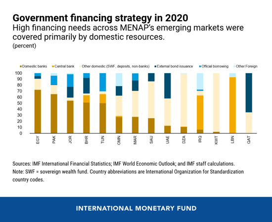 Although one-third of MENAP countries tapped international financial markets—representing 25.5 percent of worldwide emerging market issuances—domestic financing played a critical role, particularly during the first phase of the crisis when international markets were disrupted. For instance, governments in Egypt, Jordan, Pakistan, and Tunisia covered more than 50 percent of their public gross financing needs with domestic bank financing in 2020.