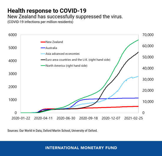 New Zealand has successfully pursued a strategy of eliminating COVID-19 infections, centered around stringent public health measures. These have included a strict lockdown early in the pandemic; managed quarantine requirements; a focus on testing, contact tracing, and social distancing; and ongoing strict travel restrictions. The result has been remarkable, with very few infections and deaths.