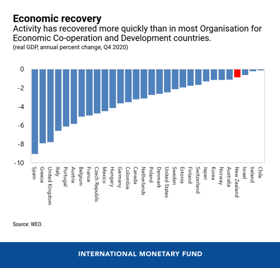 Once community transmission was eliminated and lockdown measures eased, the economy rebounded rapidly in the second half of 2020. By the fourth quarter of 2020, New Zealand’s growth performance ranked near the top among Organisation for Economic Co-operation and Development countries. In our latest assessment, we project that, despite continued, strict travel restrictions, real GDP will grow by 4 percent in 2021, which should lead to lower unemployment and positive income growth.