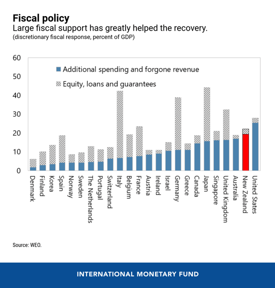 In addition to the successful health response, large-scale economic support enabled this fast recovery. New Zealand’s fiscal support package, among the largest in the world relative to the size of the economy, featured large wage subsidies to retain employment during the lockdown and beyond, allowing businesses to rapidly re-open once conditions permitted.