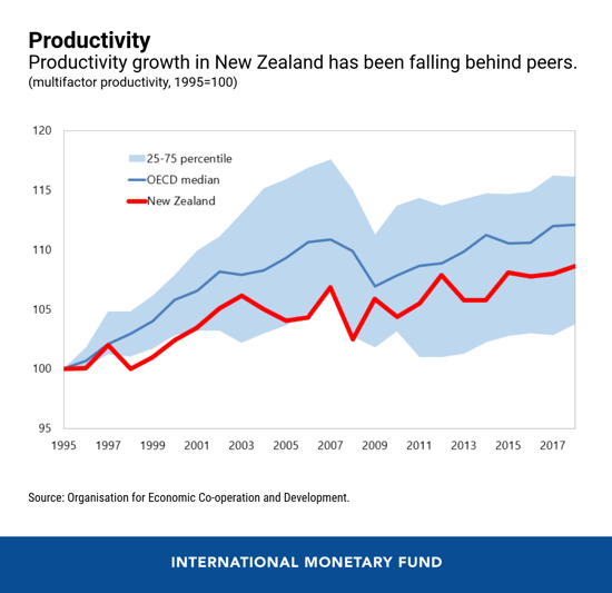 Estimates for productivity growth—how much output can be generated with a given level of inputs (labor and capital)—show that New Zealand’s performance has persistently lagged other advanced economies. Looking at the data closely, several factors contribute to this long-term trend.
