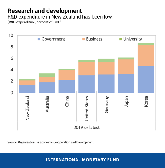 Both the government and private sector lag peer countries in R&D spending, hampering productivity growth. As R&D spending is subject to uncertainty—there are no guarantees investments will pay off in every case, and intangible assets are not liquidated easily—the government can contribute by increasing its own spending and diffusing any innovations to the private sector, and by providing more incentives for companies to encourage higher private sector R&D spending. As the government reviews how R&D is conducted and financed in New Zealand, a number of vehicles already exist to ramp up public expenditure and catalyze private sector activity. The Crown Research Institutes, which have a track record in this area, can be strengthened, while the tax credit scheme to support private R&D could be expanded.