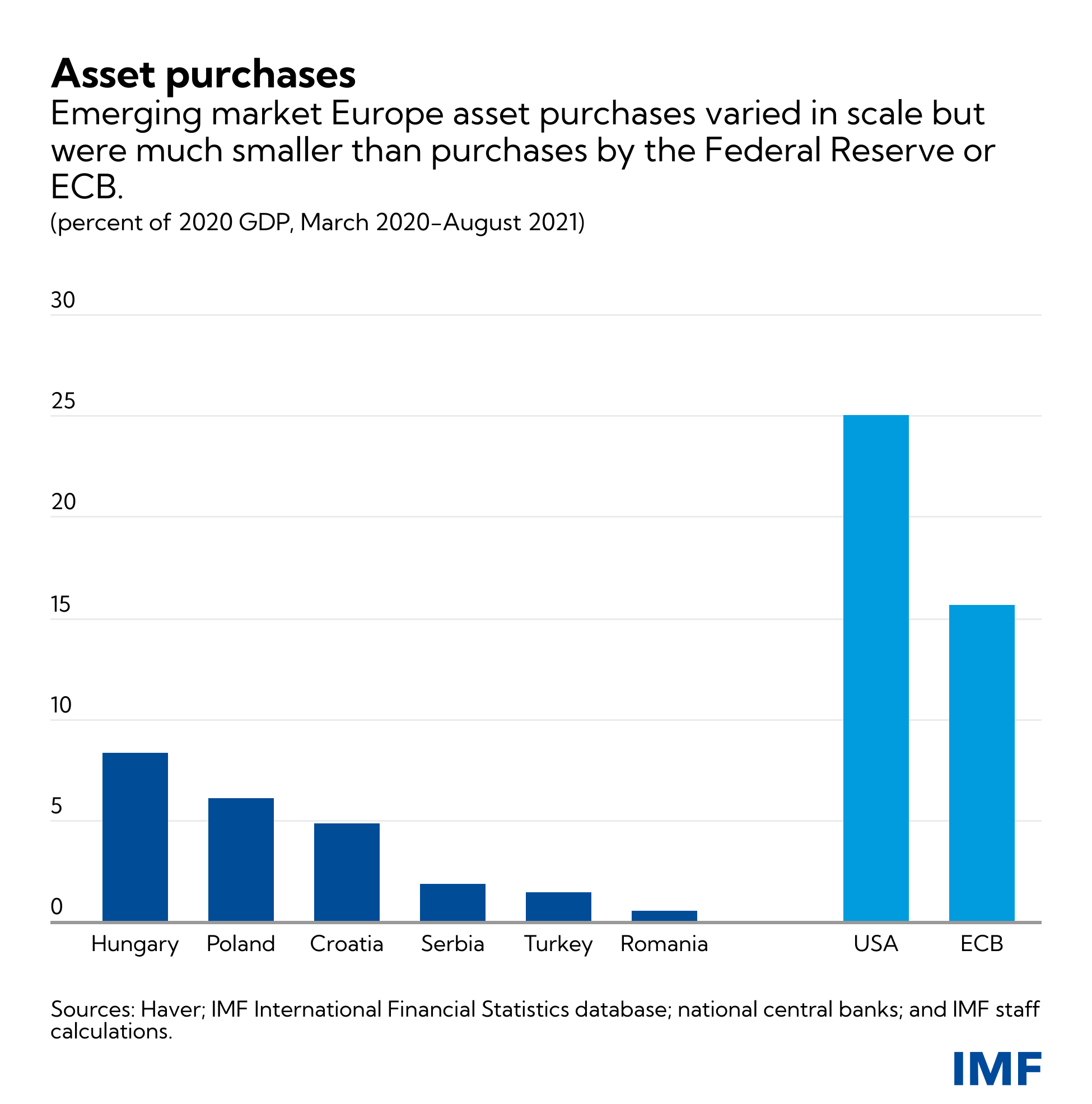 Amid the financial market turmoil at the start of the pandemic, central banks in Croatia, Hungary, Poland, Romania, Serbia, and Turkey rolled out asset purchase programs (APPs), buying up local currency bonds issued by governments but also by the private sector in the case of Hungary. New IMF research suggests that asset purchases in emerging Europe contributed to the relief of financial market dysfunction, without signs of destabilizing effects. With this goal achieved and to support the transmission of higher policy rates to the longer end of the yield curve, central banks in emerging Europe should taper or end asset purchase programs once monetary policies are tightened.