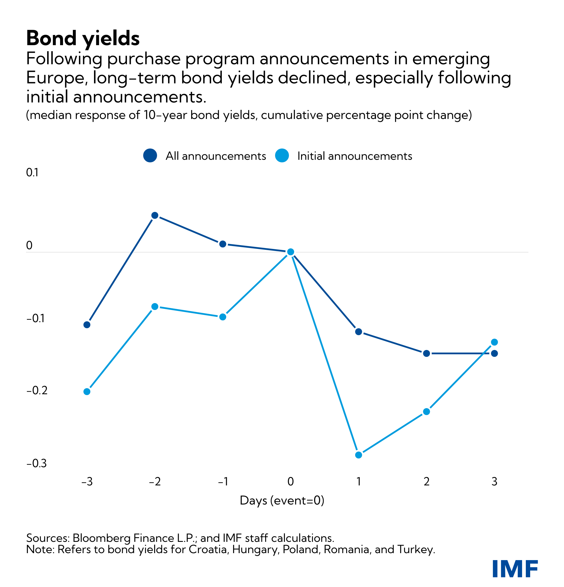 IMF research suggests that APPs in emerging Europe were successful in alleviating market dysfunction in the immediate aftermath of the pandemic shock. Using an event study approach, we find evidence that APP announcements led to an easing of bond market liquidity pressures and a reversal in the surge in term spreads.