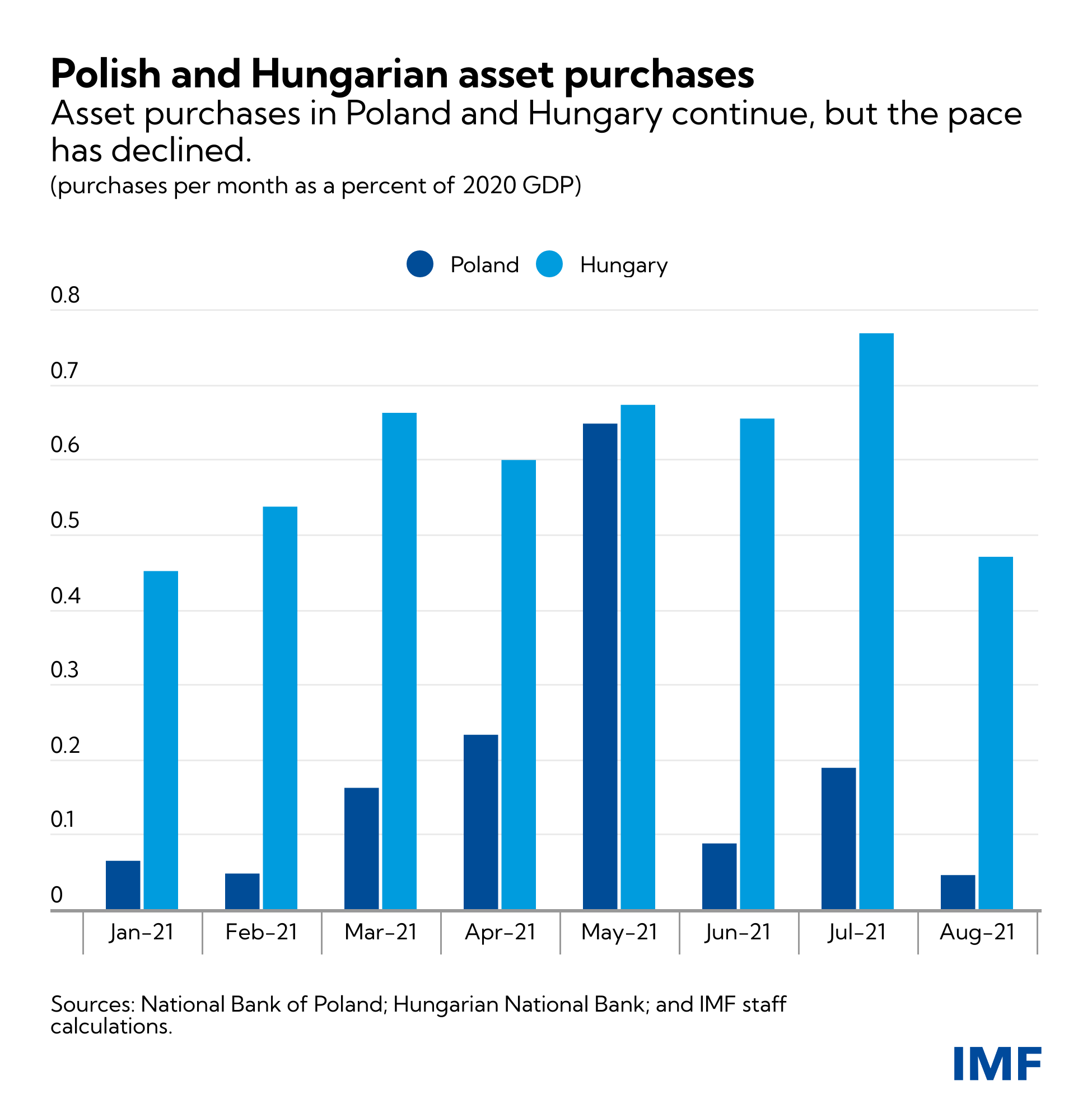 In August, the National Bank of Hungary announced that it would begin to gradually reduce its purchases of government bonds. While the National Bank of Poland has not yet raised interest rates, the pace of purchases has slowed significantly from the spring months.