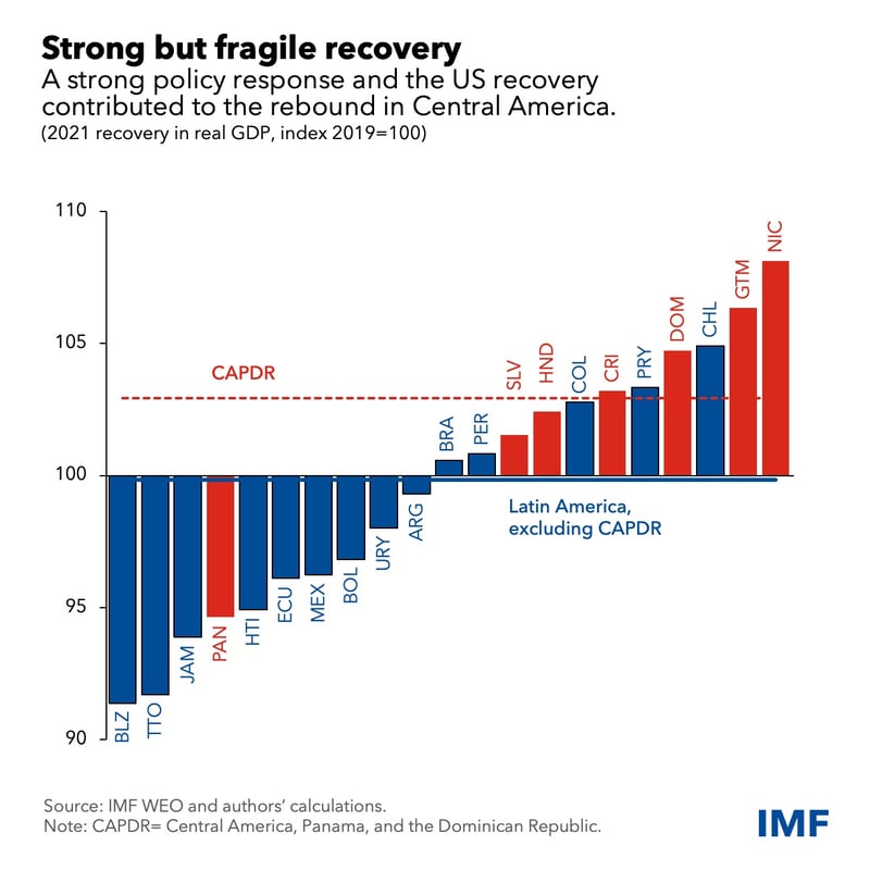Since the onset of the pandemic, the economies of Central America, Panama, and the Dominican Republic (CAPDR) were among the best performers in Latin America. By 2021, all except Panama had surpassed the pre-pandemic output levels.