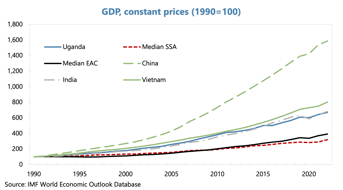 For this next bit of my intervention, I want to ask you to cast your minds back to 1990. To my mind, policymakers here in Uganda and indeed elsewhere in the region faced three major challenges: (i) getting growth started; (ii) sustaining high growth for decades; and (iii) engendering structural transformation. How have outcomes fared on this count?