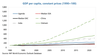 The second challenge, sustaining sufficiently high growth for decades, has been the more difficult feat for developing countries. But it is a challenge that Uganda has accomplished rather successfully. Between 1992 and 2011, Uganda’s real GDP growth of 7 percent per year on average was almost double the median sub-Saharan African or East African Community (EAC) growth rate. Uganda’s performance in those years was impressive even compared with the Asian success stories of India and Vietnam. Growth has slowed a bit over the past decade, with Uganda falling behind its Asian peers, it still outperformed the median sub-Saharan African country. High population growth over this same period, however, meant that the gains were less rapid in per capita terms. Specially, between 1992 and 2011, whereas per capita income increased threefold in Vietnam, it increased just twofold in Uganda. Still, I do not want to diminish Uganda’s achievement. Sustaining growth such uninterrupted growth for a landlocked country with the security challenges that prevail in some neighboring countries is a commendable feat.